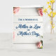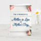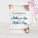 Designed with a rustic touch, the card shows a white, horizontally planked wood background that feels calm and welcoming. Centered on the front, the message reads “FOR A WONDERFUL Mother in Law ON Mother’s Day” in deep blue, drawing the eye right away. The smaller words like “FOR A WONDERFUL” and “ON Mother’s Day” use a simple, modern style, while “Mother in Law” appears in a flowing cursive-like look that adds a gentle, affectionate tone ❤️. The bright white wood grain peeks through softly, giving the blue lettering extra contrast without feeling harsh. In each corner, a light pink flower blooms, and a couple of them include small green leaves that lean inward as if framing the message with care 🌼. The overall lighting looks soft and diffused, with no sharp shadows, so the design feels tender and close. Four pale pink blossoms sit near the edges, one in each corner, against the white plank texture.