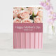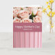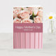 This card features a softly divided layout with a cluster of blush-pink roses filling the top section, their petals fading from peachy centers to creamy edges under gentle, diffused light. Small touches of green around the blooms add a fresh, natural contrast, like a quiet garden moment shared with care ❤️. Across the middle, a muted rose-pink horizontal band carries the main message in crisp white lettering, centered and easy to read. The larger line says “Happy Mother’s Day,” and just beneath it, in smaller white text, it reads “Mother in Law!” with a friendly, close-knit tone. The calm pink palette and smooth transitions between sections give the design a tender, affectionate feel without needing extra decoration 🌼. Below the banner, the bottom portion shifts to pale pink vertical panels that feel neatly arranged, like a softly structured backdrop. The roses sit above the centered white text on the rose-pink band, while the pale pink striped panels fill the lower third of the front.