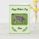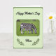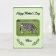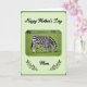 This greeting card centers on an adult striped horse-like animal and its smaller youngster, both lowering their heads to graze on a bright green field, their matching coats creating a gentle sense of closeness ❤️. The larger animal stands protectively near the little one, and their calm, side-by-side posture suggests a trusting bond. Soft natural light falls across their black-and-white stripes, with the background slightly blurred so the pair feels like the main focus. Near the top, the message “Happy Mother’s Day” appears in black, flowing lettering, spaced neatly above the scene. Near the bottom, the word “Mom” is set in black and framed on both sides by slim green olive branches, adding a quiet touch of celebration 🌼. The overall layout feels balanced, with the animals centered and the text aligned to guide the eye from top to bottom. A pale green rectangular frame with rounded corners sits inside a deeper green border, and a small reddish-brown tint shows on the animals’ muzzles.