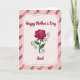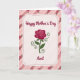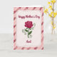 This card features a deep magenta rose centered inside a pale pink frame, with layered petals outlined in a darker tone that gives it a tender, cared-for look ❤️. Curled dark green vines flank the flower like gentle arms, adding a cozy, affectionate touch to the scene. Near the top, the words “Happy Mother’s Day” appear in flowing deep red lettering, arcing slightly above the framed rose. Below the frame, “Aunt” is placed in the same deep red style, spaced neatly so it feels balanced and easy to read. The frame itself has a thin darker pink border and softly scalloped corners, like a delicate picture window. Behind it, diagonal stripes alternate between light pastel pink and a slightly deeper pink, creating a soft rhythm across the background 🌼. Small repeating pink roses with tiny green leaves are scattered over the stripes, echoing the central bloom. The overall look is filled with pink tones and leafy greens, with the larger rose standing out against the patterned field of smaller flowers and diagonal lines.