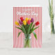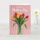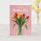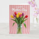 Designed with a tall, vertical layout, the card centers on a bouquet of fresh-cut flowers arranged in a slim, clear glass vase, with a gentle, affectionate mood in the way the blooms lean closely together ❤️. The petals are softly cupped and layered, mixing deep red, sunny yellow, and rich pink tones that feel like a warm embrace. Emerald-green leaves and stems surround the blossoms, and the stems show through the glass into clear water for a fresh, just-picked look. Behind the bouquet, the background stays a muted blush pink with wider, paler vertical stripes that add depth without stealing attention. Near the top, the text reads “HAPPY Mother’s Day,” with “HAPPY” in a thicker, simple uppercase style and “Mother’s Day” in a flowing cursive-like style, both set in a dark shade that stands out clearly. Soft, diffused lighting gives the petals a gentle glow and adds a light sheen to the leaves, like a quiet moment shared 🌼. The vase sits centered in the lower half, transparent and slender, with visible stems and a crisp waterline against the pink striped backdrop.