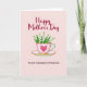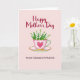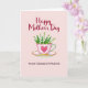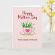 This card shows a pale pink teacup and saucer set against a soft blush background, arranged like a small gift between close friends ❤️. The cup has a thin gold rim, a scalloped top edge, and a deep pink heart on the front that feels like a quiet nod of affection. A teal-to-light-blue handle curves to the side, adding a cool contrast to the warm pastels. Inside the cup sits a bouquet of tiny white, bell-shaped flowers with fresh green leaves, leaning slightly as if tucked in with care 🌼. Near the top, “Happy Mother’s Day” is placed in deep red lettering that arches gently above the cup. Near the bottom, “TO MY DEAREST FRIEND” appears in a simpler style, also in red, spaced evenly beneath the saucer. Soft lighting creates small highlights along the gold trim and faint shadows under the saucer on the pink backdrop. The heart emblem is centered on the cup’s front, with the saucer’s gold edge catching a thin glint along its curve.