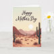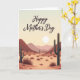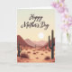 Designed with a serene, stylized desert landscape, this card shows a gentle dawn-or-dusk sky fading from creamy vanilla near the horizon to a pale blue above. Centered across the upper area, the words “Happy Mother’s Day” appear in flowing lettering in a deep warm reddish-brown, standing out clearly against the soft sky. A round white sun sits low and calm, bathing the scene in an even glow that feels tender and caring ❤️. Tall, multi-armed cacti in dark green frame the foreground on both sides like quiet guardians, adding a sense of closeness and protection. The desert floor stretches back in layered bands of terracotta and sun-bleached ochre, with rusty-red and muted-rose mountains fading lighter as they recede. Small spiky bushes in russet tones and a few smooth rounded rocks dot the sand, giving the view a gentle, lived-in texture 🌼. The cacti stand on either side while scattered bushes and stones fill the open ground beneath the low white sun.