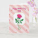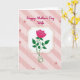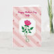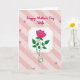 This card features a single fuchsia rose at the center, with layered petals and a curling stem that leans gently like it’s being offered with care ❤️. Deep green leaves surround the bloom, adding contrast while keeping the focus on the flower’s tender presence. The rose sits inside a white ornamental frame, outlined by a thin dashed gold border that adds a soft decorative touch. Behind it, diagonal stripes in pale pink create a cozy backdrop with a light gingham-like texture. Faint line drawings of small rosebuds are scattered across the background, echoing the main flower in a quiet, romantic way 🌼. Near the top, the words “Happy Mother’s Day Wife” appear in flowing magenta lettering, centered above the framed rose. The text color closely matches the rose, tying the top message to the central image. The frame’s white shape has curved edges, and the gold dashes trace the border evenly all the way around.