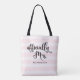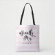 This trendy, stylish tote features modern black typography that says "officially Mrs." plus your new last name, all on a pink and white striped background.