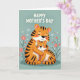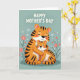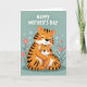 This greeting card features two striped, cat-like creatures cuddled close in the lower half, with the larger one wrapping its arms around the smaller one in a protective, affectionate pose ❤️. Their eyes are gently closed and their small smiles tilt toward each other, suggesting a quiet bond like close friends or family sharing a private moment. Warm orange fur is layered with dark stripes, while creamy white accents brighten their muzzles and bellies, and a light blush sits on their cheeks. Behind them, a muted teal-green background keeps the scene calm and cozy, letting the embrace stand out. Small blossoms in soft pink and white, along with thin green leaves, curl around the pair like a floral frame 🌼. Across the top, the words “HAPPY MOTHER’S DAY” are set in rounded white lettering, centered and easy to read against the teal. The overall layout draws your eye from the message down to the tender hug, with the flowers balancing the space around them. Pink-and-white blooms with slender green stems cluster along the sides and near the bottom edge of the design.