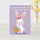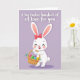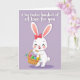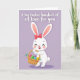 This card features a cheerful white bunny 🐰 centered low on a soft lavender background, with pink-lined ears, a coral bow, and a gentle smile that feels like it’s meant for someone close. Its eyes are closed with small lashes and rosy cheeks, giving it the look of quietly enjoying a sweet moment shared with a friend. The bunny holds a woven wicker basket close to its chest, as if offering it with a tender, caring gesture. Inside are several decorated eggs with diagonal stripes in fuchsia, green, sky blue, and yellow, adding a springtime sparkle 🌷. A few green ribbon loops peek over the basket’s rim, adding texture and a hint of movement. Near the top, a short message in white lettering sits centered above the bunny, standing out clearly against the lavender. Soft shading under the bunny anchors it to the page while keeping the scene light. The basket’s weave is drawn with fine lines, and the striped eggs sit snugly together in the middle of the basket.