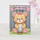 Designed with a sweet digital illustration style, the front shows a stylized bear with warm brown fur, pink inner ears, rosy cheeks, and soft pink paw pads, sitting front and center with a gentle, affectionate gaze. Its arms wrap around a large shiny egg with blue and pink stripes, as if hugging a treasured gift from a close friend. A small pink bow rests on top of the bear’s head, adding a tender, dressy touch. Behind the bear, a rustic gray wooden fence stretches across the scene, with bright green grass at the bottom and a few decorated eggs tucked into the blades 🌷. Near the top, a pink banner spans the width with the message “First Easter” and “Super Goddaughter” in clear lettering, set to stand out against the pale background. Above the banner, a garland of glowing egg-shaped lights in pink, yellow, and light blue hangs in a gentle curve, echoing the scattered eggs below 🐰. Pastel tones dominate throughout, with smooth shading on the bear and glossy highlights on the striped egg. The fence planks show faint wood grain lines, and the grass is dotted with small egg shapes in soft spring colors.