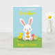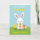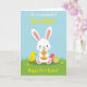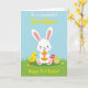 This card shows a stylized white bunny with rosy cheeks and a small, tender smile, holding a decorated egg close as if sharing it with a friend 🐰. Its long ears are lined with soft pink, and its little paws curl around an orange-and-yellow egg covered with stripes and dots. To the left stands a tiny yellow chick with an orange beak, angled toward the bunny like it’s joining in on the moment. On the right, two more patterned eggs sit on the grass—one bright pink with golden bands and spots, and one lime green with multicolored dots and a zigzag trim. The scene is set on a green foreground with simple grass details and a single yellow flower 🌷. Above it, a pastel blue sky keeps the background open and calm, letting the characters feel close and connected. The greeting text sits near the top in a warm, spring-like color that stands out clearly against the blue. The bunny is centered on the green ground, with the chick on the left and the two eggs grouped on the right beneath the open sky.