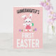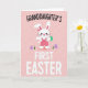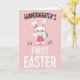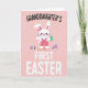 This card features a white, human-like bunny with pink inner ears and rosy cheeks, wearing pink overalls and a small pink bow on one ear 🐰. The bunny stands centered on a pale pink background with faint, scattered shapes that add gentle texture. Its open-armed pose and soft smile suggest a friendly, caring welcome, like it’s greeting someone it loves. In one paw, it holds a green striped decorative oval, while two lavender patterned ovals rest nearby among a few thin green grass blades. Near the top, a line of dark text in flowing cursive lettering sits above the character, and near the bottom, a second line appears in bright white, simple lettering that stands out clearly. The overall lighting looks even and sunny, keeping the scene light and calm 🌷. The green oval shows alternating light and darker green stripes, and the lavender ovals include small pattern details against the pale background.