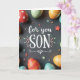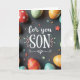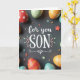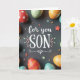 This card features a dark, matte gray background with white lettering centered in the middle that reads “for you SON,” with “for you” in flowing cursive-style lettering and “SON” in large capital letters. Soft pastel leaf and flower flourishes frame the text, curling gently around it like a quiet hug 🌷. Around the edges, decorated egg-shaped pieces in red, orange, green, and blue crop into the scene, as if gathered close to surround the message. Their patterns mix dots, curving lines, and stripes, and the way they lean inward gives the layout a friendly, affectionate feel, like a family moment paused in time 🐰. Small star shapes and tiny round accents are scattered across the surface, adding little sparks of color without crowding the main words. The lighting is diffused and gentle, creating soft shadows that make the eggs and decorations look slightly raised from the background. Several patterned eggs sit near the corners, with a few tiny stars and dots sprinkled between them on the gray surface.