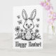 Designed with a monochrome illustration, the card features a friendly bunny 🐰 with long ears framing a bright, open smile and shining eyes. The bunny sits in a relaxed pose on a patch of grass, holding a decorated egg close to its chest as if sharing a quiet, affectionate moment with the viewer. Simple bands and wavy lines wrap around the egg, giving it a festive look without adding extra colors. Around the bunny, small wildflowers dot the ground, and three tiny winged insects hover overhead, adding gentle movement to the scene 🌷. The shading uses soft gradients and fine outlines to give the bunny’s fur and the egg’s surface a slightly textured, touchable look. A short Easter greeting appears centered beneath the illustration in dark lettering, standing out clearly against the light background. Above the bunny, the open space stays uncluttered, while the grass blades and flower petals are drawn in thin black lines with light gray shading.