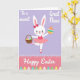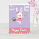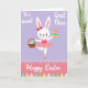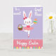 This card shows a sweet bunny-like dancer 🐇 standing in a ballet pose, balancing on one foot with a tender, friendly look in its dot eyes and rosy cheeks. It wears a bright pink top, a fluffy tutu skirt, and matching slippers tied with small red ribbons, with a tiny red bow tucked between its white ears. In one hand it carries a woven basket filled with pastel decorated eggs, dotted and striped like little gifts meant to be shared. In the other hand, it holds up one larger egg with yellow and pink stripes and a green zigzag, as if showing it off to someone just out of view. The background fades from soft lavender at the top into a warm coral band at the bottom, separated by a white dotted border that looks like stitching. Near the top, a line of dark text reads “To a sweet Great Niece,” and near the bottom, matching text says “Happy Easter,” framing the character and the scene 🌷. Along the coral band, a row of small patterned eggs marches across in pastel colors beneath the bunny.