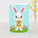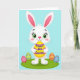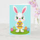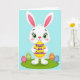 This card features an upright white rabbit 🐰 centered against a pale blue background, facing forward with large green eyes, a tiny pink nose, and softly blushed cheeks. Long ears rise above its head with gentle pink inner shading, and the rounded shapes give it a sweet, friendly look. The rabbit hugs a big yellow egg close to its chest, as if holding it like a treasured gift for someone special. Across the egg, purple horizontal stripes frame a short celebratory message in small, neat lettering placed near the middle. Below, the rabbit stands on a tuft of bright green grass where several smaller decorated eggs rest, creating the feel of a shared springtime moment 🌷. Those eggs show mixed patterns like dots, zigzags, and ringed bands in pink, lime green, orange, and cyan, scattered around the rabbit’s feet. A soft highlight on the eggs and a light sheen along the rabbit’s eyes add a glossy finish, while the grassy patch forms a simple base at the bottom edge.