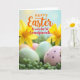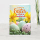 This card shows a spring scene with a small group of decorated eggs resting close together in a nest of green, succulent-like leaves, suggesting a cozy bond like friends leaning in for a photo 🐰. The eggs are colored in soft pastels—pale green, gentle pink, and light brown—with careful patterns that feel affectionate and shared. One green egg has thin white stripes, while the pink one carries deeper lavender dots that look like they were added with extra care. The background fades into a softly lit morning glow, giving the foreground a close, intimate focus 🐇. Two bright yellow flowers sit higher up and slightly out of focus, like cheerful onlookers framing the scene. Across the upper area, a holiday greeting is placed prominently, with part of the text in warm orange and the rest in a deeper red, standing out against the light backdrop. The letters are smooth and flowing for the main words, with simpler, thicker lettering for the supporting words, centered above the eggs. The yellow blossoms hover near the top edges, softened by blur, while the patterned eggs stay sharp in the lower half.