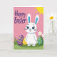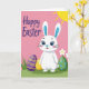 This card shows an upright white bunny character 🐰 with big blue eyes, soft rosy cheeks, and a small pink nose, smiling as if it just spotted a friend nearby. Its tall ears rise above its head with blue inner details, giving the face an open, affectionate look. The bunny stands on bright green, stylized grass, nestled close to three decorated egg shapes that feel like little gifts shared between companions. On the left sits a purple egg with yellow stripes beside a smaller golden egg with gentle wavy lines, while on the right a green egg is dotted with blue spots near simple white daisy-like flowers 🌷. The background is a calm pink sky with a yellow sun glowing in the upper right corner. In the upper left, a seasonal greeting is written in flowing lavender lettering, leaving the bunny and eggs as the main focus below. White daisies with yellow centers edge the green grass near the speckled green egg.