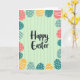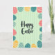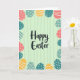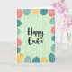 This card features a dark, flowing “Happy Easter” greeting centered on a soft pastel green background with gentle vertical stripes, setting a calm spring scene 🌷. Around the edges, a border of egg-shaped decorations wraps the design like a friendly hug, drawing your eye inward. The eggs come in soft coral, teal, light blue, and sunny yellow, mixing together like a shared basket between close friends 🐰. Many eggs are dotted with small white polka dots, while others carry white horizontal lines or wavy stripes, creating a lively back-and-forth that feels like quiet teasing and affection. The main text sits in the open middle space, with the darker lettering standing out clearly against the pale green so it reads easily at a glance. The background stripes are slightly uneven, giving the surface a cozy, painted look rather than a stiff, mechanical finish. Some striped eggs tilt at different angles, adding movement like a gentle dance around the greeting. White dots scatter across several coral and teal eggs, while wavy white lines ripple across a few blue ones near the corners.