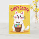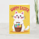 Designed with a bright spring look, the card features a cute white bunny with soft pink inner ears and rosy cheeks, smiling with wide dark eyes and a tiny red nose 🐰. The bunny holds a rustic woven basket close to its chest, as if offering it to someone just out of view, adding a gentle, friendly closeness to the scene. Inside the basket are several decorated eggs covered in stripes and check patterns in blues, greens, pinks, and yellows. The background is a solid, sunny yellow that keeps everything feeling open and warm. Across the top, the words “HAPPY EASTER” curve in large fuchsia letters, centered above the bunny’s head 🌷. The shapes are smooth and simple, with small touches of texture suggested in the basket weave and the egg patterns. The bunny’s whiskers stretch outward on both sides, and the basket sits slightly angled with the colorful eggs peeking over the rim.