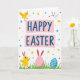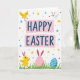 This greeting card features a digital illustration on a white background, with a festive message centered across two soft pink ribbon banners in rounded deep-blue lettering. Around the banners, spring decorations fill the space, creating a friendly, affectionate scene where the characters seem to share the moment together 🌷. In the upper left, a bright yellow little bird stretches its wings as if mid-leap, angled toward the message like it’s showing it off to a friend. Near the bottom left, another yellow chick with pink bunny-ear shapes on its head steps through green grass, posed as if trotting alongside a companion 🐰. In the upper right, a small white winged bunny-like creature with pink ears and a tiny red nose drifts gently, turned inward as though watching the others with a tender, welcoming look. The bottom area is anchored by two decorated eggs nestled in the grass—one pale pink with wavy white lines, and one blue with neat white stripes—while small confetti stars and dots in yellow, blue, and red scatter around the edges. The confetti pieces appear as tiny star shapes and round dots sprinkled across the white space, especially near the corners and around the banners.