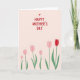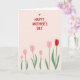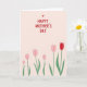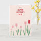 A warm message of celebration fills the top half of the card, written in hand-drawn red lettering that feels like it was shared between close friends or sweethearts ❤️. Just above the words, a small red heart sits like a gentle accent, adding a quiet note of affection. The background stays a pale pastel pink, giving the red message plenty of space to stand out. Along the lower half, a garden of simple tulip-like flowers stretches across the scene, their shapes soft and easy on the eyes. Most blooms are blush pink, creating a tender, companionable mood, while one deeper red flower suggests a special someone in the crowd. Slender green stems and small leaves rise upward in a light wave, as if the flowers are leaning toward each other in friendly closeness 🌼. The red text is centered near the top with the heart directly above it, and the bottom edge is lined with pink blooms and green stems against the uniform pink backdrop.
