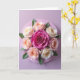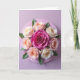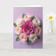 Designed with a balanced floral arrangement, the card centers on a deep fuchsia bloom that feels like the heart of the scene, drawing you in with a quietly romantic focus ❤️. Around it, seven flowers open in soft peach and creamy ivory, their petals angled toward one another as if sharing a gentle, friendly closeness. The bouquet sits on a circular lavender‑pink disc, with leafy greens fanning out to frame the flowers like an embrace. A pale pastel background keeps everything calm and airy, letting the blossoms feel like the main conversation on the page. A short greeting appears near the top in a small, warm pink tone, and a second line rests near the bottom in a slightly deeper fuchsia for balance 🌼. Soft lighting skims across the petals, showing velvety texture and subtle ripples without harsh shadows. The central flower’s tightly coiled core contrasts with the surrounding petals that curve outward in smooth, rounded layers.