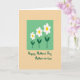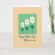 Designed with a soft, rounded rectangle in pastel green at the center, this card frames three stylized flowers in a gentle, affectionate scene ❤️. Each bloom has crisp white petals and a sunny yellow center, arranged from left to right in increasing size, like a quiet little progression of growing closeness. Slender deep-green stems and small leaf accents anchor the flowers inside the green panel, giving the layout a calm, steady balance. The background is a muted peach-beige with a faint texture, wrapping the central panel in a cozy, friendly warmth 🌼. Beneath the floral panel, the text sits centered near the bottom and reads “Happy Mother’s Day Mother-in-law” in deep green lettering. The simple spacing leaves plenty of breathing room, letting the flowers and message feel like they’re leaning toward each other with tender ease. The three blossoms step upward in size, with the smallest on the left and the largest on the right, all set against the softly textured peach-beige field.