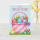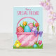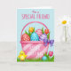 This design shows a spring scene with a pink basket tied with a small purple bow, sitting front and center and overflowing with patterned oval eggs in reds, blues, and violets. Bright tulips in orange and deep pink rise from the basket, their green stems leaning close together like friends sharing a secret 🌷. A soft bed of rich green grass spreads along the bottom, and one small blue egg peeks out from the blades as if waiting to be found 🐰. On the left side, a tiny yellow chick with wide, friendly eyes stands nearby, adding a gentle, companionable touch to the scene. The background is a light powder-blue field sprinkled with small white dots that feel like floating confetti. The words “FOR A SPECIAL FRIEND” appear near the upper area in a darker purple tone, while “EASTER GREETINGS” sits lower down in matching purple text to frame the picture. The basket’s curved handle arches over the eggs, and the purple bow is centered neatly at the top front.