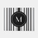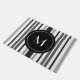 A stylish design of stripes in various shades of gray, black and white with a black circle. The initial monogram letter in the circle can be customized.