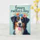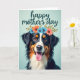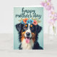 This greeting card features a tri-colored dog set against a calm light blue-green background, filling most of the front with an inviting presence. Its black, white, and warm russet fur is softly lit, and the plush texture feels cozy and close, like a trusted companion leaning in. The dog looks straight out with amber eyes that seem to hold a tender, friendly connection, and its slightly open mouth shows a small pink tongue that reads like a gentle grin ❤️. A ring of flowers rests on its head, mixing coral-orange and pale sky-blue blooms with leafy green sprigs, adding a sweet, affectionate touch 🌼. Near the top, a short greeting is placed above the portrait in flowing deep teal lettering, centered so it stands out without crowding the face. The overall layout stays simple and balanced, with the background kept uncluttered so the gaze and floral crown do most of the talking. The floral wreath includes several rounded petals in coral-orange and soft blue, with small green leaves tucked between them.