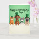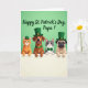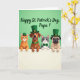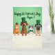 Designed with a cheerful group of four animal friends, the scene shows two cats and two dogs facing forward and peeking over an off-white ledge, their paws resting close together as if they’re leaning in for a friendly photo. A striped orange cat with bright green eyes sits beside a calm brown dog, while a sleek gray-and-white cat and a wrinkled fawn-colored dog complete the lineup with gentle, affectionate expressions. The background is a solid light green field that sets a festive St. Patrick’s Day mood 💚. Three of the pets wear small green top hats with gold buckles, and the accessories tie the group together with a green bow tie on one cat and a matching green collar on one dog ☘️. Their close spacing and soft, attentive gazes suggest camaraderie, like they’re sharing a sweet moment with the viewer. Above their heads, a greeting appears in deeper green lettering, centered near the top and easy to read against the light background. The off-white ledge runs straight across the lower portion of the design, with the pets’ paws lined along its edge.