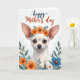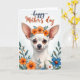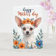 This design shows a small white-furred dog at the center, drawn with an endearing expression and upright ears that frame its gentle face ❤️. A ring of bright orange blossoms and leafy green sprigs rests on its head, adding a sweet, celebratory touch that feels like a quiet gift between close friends. The dog’s warm brown eyes look straight ahead with a tender, trusting gaze, set above a glossy black nose and fine whiskers. Around the portrait, a garden-like border of orange, soft blue, and white flowers mixes with green stems and foliage, creating a cozy scene that suggests companionship in a sunny backyard. Near the top, a short message is placed in flowing lettering, with some words in deep blue and others in warm orange for contrast. Behind everything, the background fades from a very pale blue-gray at the top into white, keeping the focus on the face and floral frame 🌼. The flowers cluster more densely along the sides, with small petals and leaves curling inward toward the dog’s cheeks.