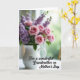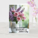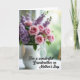 This card features a still-life bouquet that feels like a quiet gift between close friends ❤️. At the center, soft pink flowers with gently curling petals mingle with thin stems topped by tiny purple blooms, creating a tender, close-knit look. The arrangement sits in a smooth white ceramic pitcher that keeps the focus on the flowers’ delicate textures. Behind it, light spills in from a sunlit backdrop that fades into blurred greens and pale yellows, like a garden seen through a window. Gentle shadows along the petals and clustered florets add depth, as if the blooms are leaning toward one another in an affectionate pause. A flowing message in dark lettering is placed across the lower portion of the design, standing out against the lighter background without covering the main bouquet 🌼. The pitcher’s curved handle is visible on one side, with the brightest highlights catching along its rim and shoulder.