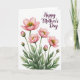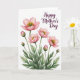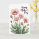Designed with a fresh floral illustration, the card features a cluster of soft pink blossoms rising from the lower edge on slender green stems, set against a plain white background. Several flowers are fully open while others remain as small buds, creating a gentle sense of closeness, like friends leaning in toward one another ❤️. The petals are cup-shaped with rosy gradients that deepen near the center and fade toward lighter, almost sheer edges. In each bloom, a ring of golden-yellow stamens surrounds a tiny emerald-green center, adding a bright contrast that draws the eye. Leaves in deeper forest green and lighter moss tones spread around the stems, giving the arrangement a calm, growing-from-the-ground feel. In the upper right area, the words “Happy Mother’s Day” appear in an elegant deep plum style, floating neatly above the flowers. The open space around the bouquet keeps the focus on the tender pairing of blossoms and buds, like a quiet hug 🌼. Fine yellow texture details are visible within the flower centers, with the plum text sitting slightly above and to the right of the tallest bloom.