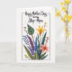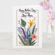 The front design shows a stylized bouquet of mixed flowers and leaves inside a thin, sketch-like rectangular frame on a white background. Near the top, a family-focused message sits above the bouquet in dark lettering, centered and easy to spot. A tall golden-yellow flower with open petals rises in the middle, while a coral-pink bloom rests at the lower right, as if leaning in close like old friends ❤️. Deep green leaves, including a few with subtle stripes, fill out the base and sides to give the arrangement a cozy, gathered look. Purple and soft blue fronds curl outward with gentle motion, adding the feeling of a warm embrace between the shapes. Small sprigs dotted with round berries in red, blue, and yellow pop through the greenery like little shared moments 🌼. Scattered across the white space are tiny pale-pink hearts, floating around the frame and bouquet.