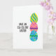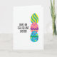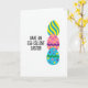 This card features a bright graphic layout on a white background, with three decorated egg shapes stacked vertically along the right side 🐰. The top egg is filled with diagonal stripes in yellow and aqua, giving it an energetic, upbeat look. Below it, a pink egg carries yellow and deep purple dots, split across the middle by a purple zigzag that feels like a teasing wink between friends. The bottom egg is light blue with scattered yellow, pink, and purple circles, and a green zigzag that adds a fresh spring touch 🌷. On the left side, a bold black greeting is set in thick, rounded lettering, placed to balance the tall stack of eggs. The text sits roughly mid-height, leaving plenty of open space around it so the design feels airy rather than crowded. The three eggs have smooth, rounded edges and are aligned in a neat column on the right.