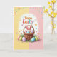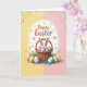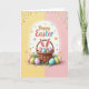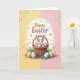 This design shows a woven basket filled with decorated eggs in soft pink, blue, green, and lavender, with stripes and polka dots adding gentle variety. A small bunny with long white ears tipped in pink peeks from the basket with a shy smile 🐰. Below, more patterned eggs sit in thin green grass with a few leafy accents, like they were set down for a quiet shared moment between friends. The background splits into two calm halves—buttercup yellow on the left and blush pink on the right—giving the scene a light springtime feel 🌷. A white oval outline frames the main picture, and tiny hearts and dots float inside it like little notes passed between close companions. Near the top corners, scattered confetti-like circles in mixed bright shades drift outward to keep the layout lively. A cheerful seasonal greeting appears in rounded, curving letters near the top, with colorful text that echoes the egg patterns. The basket’s woven texture sits at center, and the white oval border glows softly against the two-tone background.