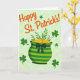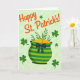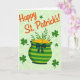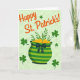 This card features a rounded pot of gold near the lower center, wrapped in alternating dark and light emerald-green stripes that feel cozy and inviting. The pot overflows with shiny gold coins marked with tiny shamrocks, with small leafy sprigs tucked between them like a fresh little bouquet. A black bow with white polka dots circles the rim, adding a dressed-up touch that reads like a friendly gift shared between close friends 💚. Above the pot, the words “Happy St. Patrick’s!” sit prominently in warm orange lettering, centered and easy to read against the background. The backdrop is a soft pastel green with a faint grid pattern, giving the scene gentle texture without stealing attention. Several three-leaf shamrocks in deeper green are scattered around the card in different sizes, like lucky confetti drifting across the space ☘️. The pot’s rounded shape, the glossy coins, and the scattered shamrocks stand out against the pale green grid behind them.