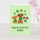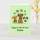 This card shows three cartoon-style puppies lined up on a pale green background, leaning toward one another like close friends sharing a joke 💚. On the left, a light brown pup wears a green sweater with a shamrock and green-rimmed glasses, its bright eyes turned toward the group. In the center, a deeper brown pup anchors the scene in a green bandana marked with a four-leaf clover, smiling with a tiny pink tongue showing as if mid-laugh. On the right, a mostly white pup with brown ears wears a green striped sweater and matching glasses, angled slightly inward to mirror the others’ togetherness ☘️. Above their heads, small green four-leaf clovers float like confetti, filling the upper space without crowding the characters. Along the bottom, dark green text reads “Happy St. Patrick’s Day! Brother,” set in a thick, easy-to-read style that stretches across the lower margin. The pups’ wide eyes, open mouths, and matching green accessories create a cozy, affectionate scene against the soft green canvas. A loose scatter of clovers drifts overhead while the dark green message sits centered at the base beneath the trio.