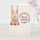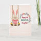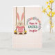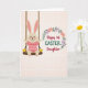 This card features an upright bunny character in soft cream tones, with pink-lined ears, a small smile, and gently rosy cheeks 🐰. The bunny sits on a rustic wooden swing, held by thick ropes that drop from above, as if someone nearby just gave it a gentle push. Near its arms, little golden bells hang from the ropes, adding a sweet, celebratory touch that feels like a shared moment between close family or friends. It wears a pink-and-white horizontally striped outfit that keeps the look simple and cozy. On the right side, a half-circle arch of flowers and greenery curves around the message, with red, yellow, and lavender blooms tucked among leafy greens 🌷. Inside that floral curve, the text reads “Happy 1st EASTER. Daughter,” with “Happy 1st” and “Daughter” in red and “EASTER” in green, arranged in the center-right area. The floral arch sits like a bright frame beside the swing, balancing the open space with a garden-like sweep of color.