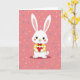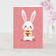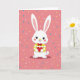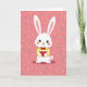 This card features a white, upright bunny with extra-long ears and big, shining eyes, giving a tender, friendly look as it faces forward 🐰. Soft rosy cheeks and a small yellow nose add warmth to its expression, like it’s about to offer a sweet surprise to someone close. The bunny wears a yellow-and-white striped shirt with a neat red bow tie at the neck, keeping the outfit bright and cheerful. In its little paws, it holds a red heart close to its chest, as if sharing affection in a simple, quiet way. The background is bubblegum pink, sprinkled with tiny dot shapes in white, blue, and yellow that feel like confetti drifting around 🌷. Any greeting text could sit near the top in white lettering, leaving the character and heart as the main focus. A faint shadow under its feet helps the figure stand out from the flat background. The red heart is centered against the striped shirt, with the bow tie just above it and the colorful dots scattered evenly across the pink field.