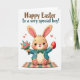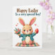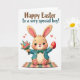 This card features a friendly bunny 🐰 centered on a bright white background, drawn with wide eyes and softly blushed cheeks that make its gaze feel gently affectionate. It wears a teal jacket with a matching bow tie, giving it a neat, dressed-up look that suits a spring celebration. Warm light falls across its rounded face and long upright ears, with pale pink inner ear details adding a tender touch. In one paw, it holds a mixed bouquet 🌷 with pink, red, yellow, and blue blossoms tucked into fresh green leaves, like a sweet offering to someone special. In the other paw, it cradles a richly patterned red oval decoration, held close in a way that suggests fondness and care. Small heart shapes float nearby, reinforcing the cozy, close-to-the-heart mood without needing extra words. A seasonal greeting appears near the top in flowing dark lettering, standing out clearly against the white space. Along the bottom, the bunny sits on a striped woven mat in muted green, peach, and blush tones.