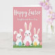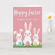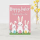 Designed with three stylized white bunny figures lined up across the lower part of the card, each has upright ears, rosy cheeks, and a soft smile that feels like a friendly hello 🐰. They sit close together in thick green grass, with their bodies angled slightly toward one another as if sharing a quiet moment. In front of each bunny is a large decorated oval with stripes, dots, and ribbon-like accents in pastel blue, light pink, and sunny yellow. A few more patterned ovals peek out from the grass around them, adding extra detail without crowding the scene 🐇. The background is a smooth wash of soft pink that keeps everything gentle and springlike. Near the top, a seasonal greeting appears in white flowing lettering, centered and easy to spot against the pink. A smaller line of white text sits just below the main greeting, also centered, like a sweet note tucked under the headline. The ovals show neat bands of color and tiny dot patterns, and the grass blades overlap their lower edges in the foreground.
