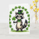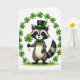 This card features an anthropomorphic raccoon centered on a white background, smiling as it holds a three-leaf clover in its left paw ☘️. Its fluffy fur mixes charcoal gray and creamy white, with a classic dark mask over its face and a striped tail curling behind. The raccoon wears a shiny black top hat with an emerald-green ribbon and a matching feather, plus a neatly tied green bow tie that makes it look ready for a friendly night out. Its big, bright eyes and slightly lifted brows give it a tender, inviting look, like it’s offering the clover to someone special 💚. A curved garland of green shamrocks frames the top and sides, forming a festive arch around the character. Any greeting text sits near the top inside the shamrock arch in green lettering, leaving the raccoon unobstructed in the middle. Below, light strokes of green grass sit at the raccoon’s feet, grounding the scene against the plain white space.