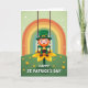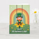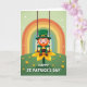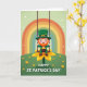 This card shows a smiling leprechaun in rich green clothing, perched on a swing with a yellow flower petal as the seat, giving the scene a light, friendly charm 💚. His tall green hat has a gold buckle and a small clover detail, and his rosy cheeks and bright grin make him feel like a cheerful pal you’d want to celebrate with. He holds a black pot tipped slightly upward, and gold coins spill out as if he’s showing off his lucky find to someone just out of frame ☘️. Above him, a wide rainbow curves across the top with soft bands of orange, yellow, and green that draw your eye down toward the character. The background is a pale green sky with tiny white flecks drifting around, like little sparkles floating on the air. Below, rolling green hills are dotted with small yellow blossoms, and the swing’s braided ropes hang straight down on either side of him. The phrase “HAPPY ST. PATRICK’S DAY” sits prominently along the lower area in bold, easy-to-read lettering. The rainbow arches across the upper portion while the leprechaun swings at center over the green hill sprinkled with yellow flowers.