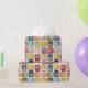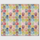This wrapping paper has a mid-century modern design of rectangles made from stripes with a white starburst on them.