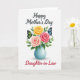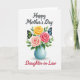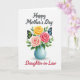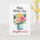 This Mother's Day card features a floral scene that feels like a gentle hug between family members, with three roses arranged close together as if leaning in with affection ❤️. A pale blue vase with a lightly textured look sits at the center, holding a yellow rose near the upper left, a blush-pink rose below it, and a deeper pink rose on the right. Soft green leaves spill outward around the blooms, creating a calm contrast against the light petals and suggesting a cozy, cared-for bouquet. Two butterflies add a tender, friendly energy—one green on the left and one blue on the right—each outlined in black with tiny white dots. Near the top, the words “Happy Mother’s Day” appear in dark gray lettering, centered above the flowers. Near the bottom, “Daughter-in-Law” is written in red lettering, centered beneath the vase, adding a warm note 🌼. The background is bright white, making the pale blue vase and the colorful roses stand out clearly. The butterflies hover near the bouquet, one to the left of the vase and the other to the right, framing the flowers with their wings spread.