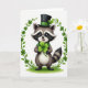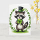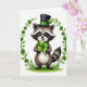 On the front of the card an upright raccoon stands centered on a bright white background, with round, shiny eyes and a gentle smile that feels like it’s meant for a close friend. It wears a black top hat with an emerald-green band and a few fresh green leaves tucked in, adding a festive St. Patrick’s Day touch ☘️. A snug scarf wraps its neck in green-and-white stripes, softening the look like a cozy hug. In its small paws, it cradles an oversized three-leaf clover close to its chest, as if offering it to someone special 💚. A neat arch of climbing shamrock vines frames the raccoon, the tiny leaves curving inward like a quiet, affectionate embrace. The greeting “Happy St. Patrick’s Day” sits above the character in green lettering, with a smaller line of text below in a lighter green. At the bottom, a small patch of brushed green grass rests under its feet, while the shamrock arch forms a balanced halo around the scene.