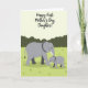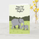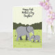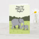 Designed with a tender scene, the front shows a large gray elephant walking close beside a smaller calf, their bodies angled in profile as they move left to right along the bottom of the card. Soft gray shading and slightly darker accents on the ears and feet give the pair gentle definition, while small white tusks add a classic touch. The calf stays tucked near the adult’s shoulder, suggesting a protective closeness that feels like a quiet, loving bond ❤️. Behind them sits a light green field with a few simple grass marks, and farther back a band of deep green trees lines the horizon. The upper half is a pale, creamy sky area that leaves plenty of open space for the message. Centered near the top, the greeting reads “Happy First Mother’s Day, Daughter!” in a flowing, dark-toned lettering that stands out clearly against the light background 🌼. A few scattered grass strokes dot the foreground beneath their feet, keeping the landscape simple and calm.