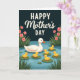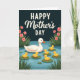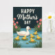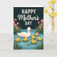 This card features a calm nature scene with a deep blue-green background and a wide stretch of cool blue water below. Near the top, a short Mother’s Day message sits centered in white lettering, standing out clearly against the darker sky. In the middle of the water, a large white water bird glides forward with a gentle, watchful tilt to her head, as if keeping close to her little ones ❤️. Five small yellow chicks float nearby, each perched on its own green lily pad, forming a loose ring that suggests closeness and care. Along the lower edges, tall green reeds and leafy plants frame the scene, adding depth without crowding the birds. Soft pink blossoms climb up both sides, their petals adding a tender, affectionate touch like a quiet bouquet 🌼. The lighting looks diffused and soft, giving the white feathers a mild glow and the water a smooth, glassy look. The chicks are bright yellow with tiny orange beaks, and the lily pads show rounded shapes with subtle veins and darker green shadows.