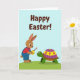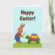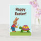 This greeting card shows a pale blue sky above a rolling green field, with “Happy Easter!” set near the top in large, bright lettering that stands out clearly. On the left, a gentle long-eared creature in warm brown shades wears red-and-blue overalls and holds a yellow bucket in one hand and a flower-tipped paintbrush in the other 🐰. Its eyes tilt toward a friendly green reptile nearby, and the two share an easy, affectionate look that reads like close friendship. The reptile smiles back, standing proudly as if posing for its friend’s careful work. Center stage is the reptile’s rounded shell, styled like a festive egg with purple stripes, a sunny yellow band, and small red flower shapes scattered across it 🌷. The background stays simple and airy, keeping attention on their faces, the paint tools, and the decorated shell. The “Happy Easter!” text sits above them against the sky, while the shell’s purple, yellow, and red patterns pop against the green body and grass. A small yellow bucket and the flower-tipped brush rest near the long-eared creature’s side, with the egg-like shell’s stripes curving smoothly around its back.
